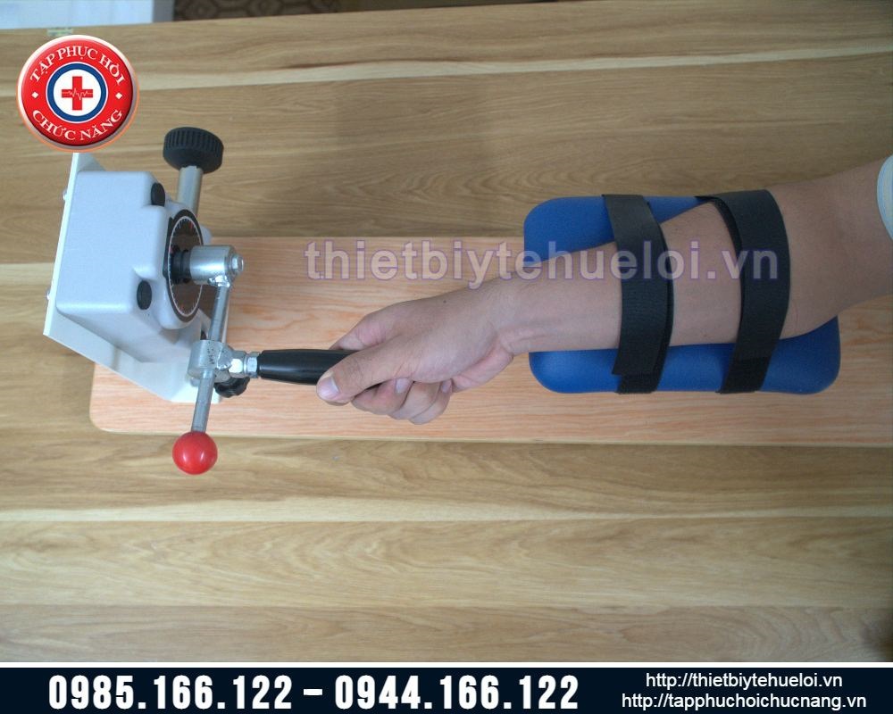 - Đặt cẳng tay lên đế đệm và cố định lại bằng 2 đai cố định đã thiết kế sẵn, điều chỉnh vị trí tay cầm và trở lực cho phù hợp, sau đó tiến hành tập luyện.