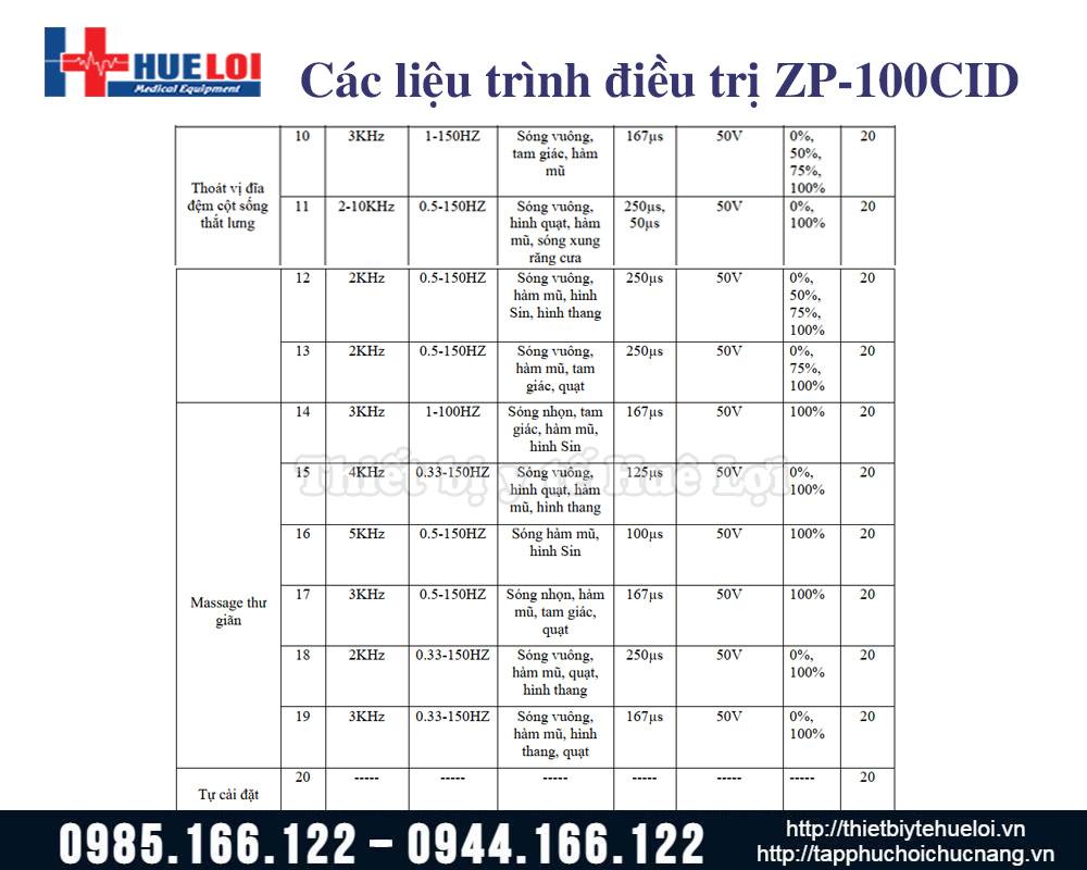 - Có 19 phương thức điều trị được tích hợp sẵn trong máy