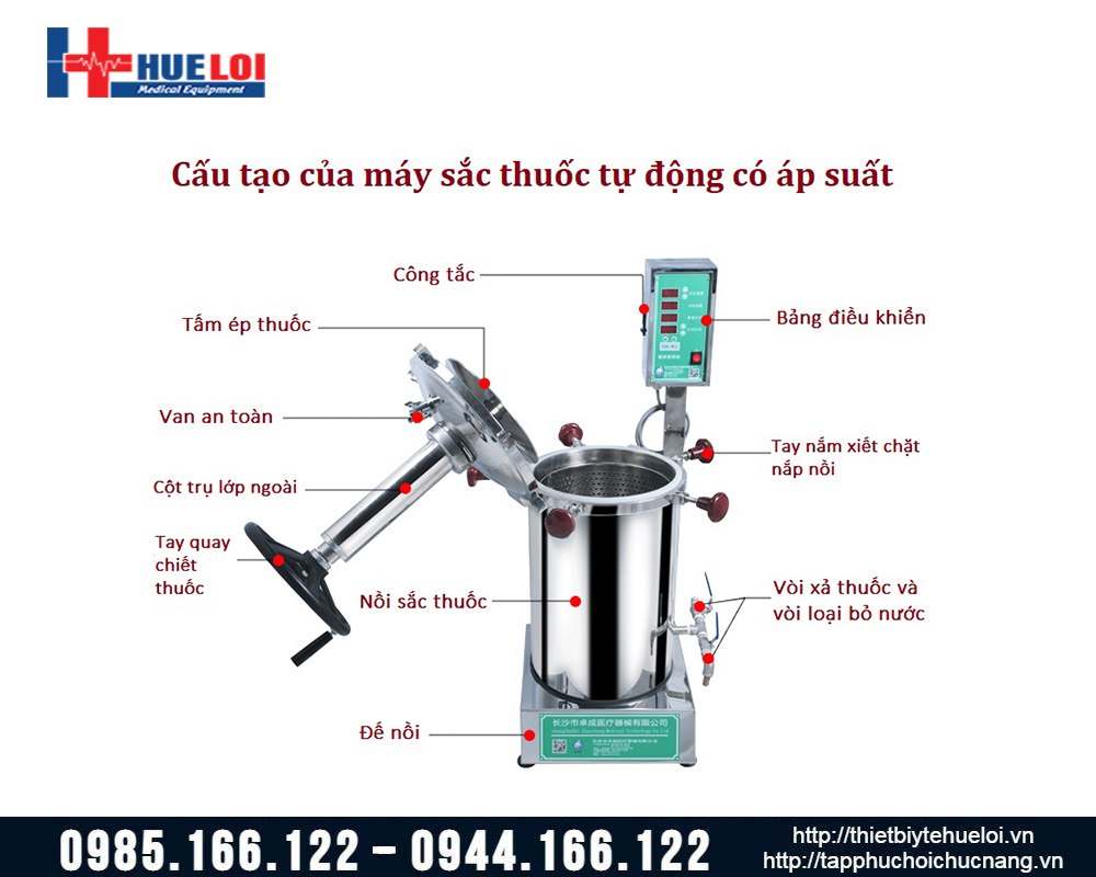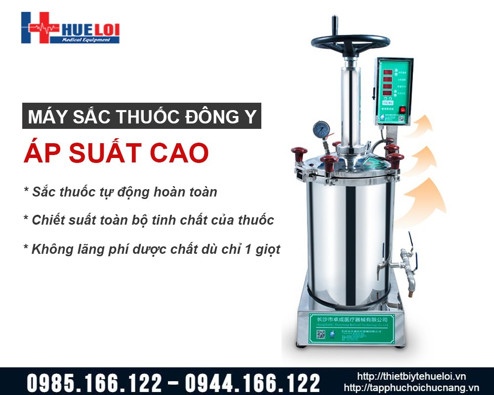 Máy sắc thuốc đông y tự động ở áp suất cao giúp thời gian sắc thuốc trở nên nhanh chóng, đồng thời với chức năng chiết ép thuốc tự động dưới áp lực cao giúp lấy hết được tinh chất của thang thuốc, không để lãng phí dù chỉ là một giọt dược liệu. Sản phẩm thích hợp sử dụng trong các bệnh viện hoặc phòng khám Y học cổ truyền.