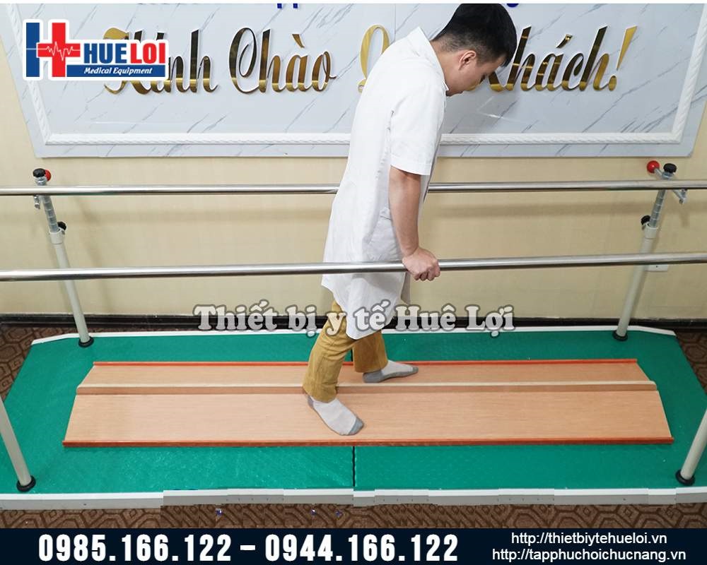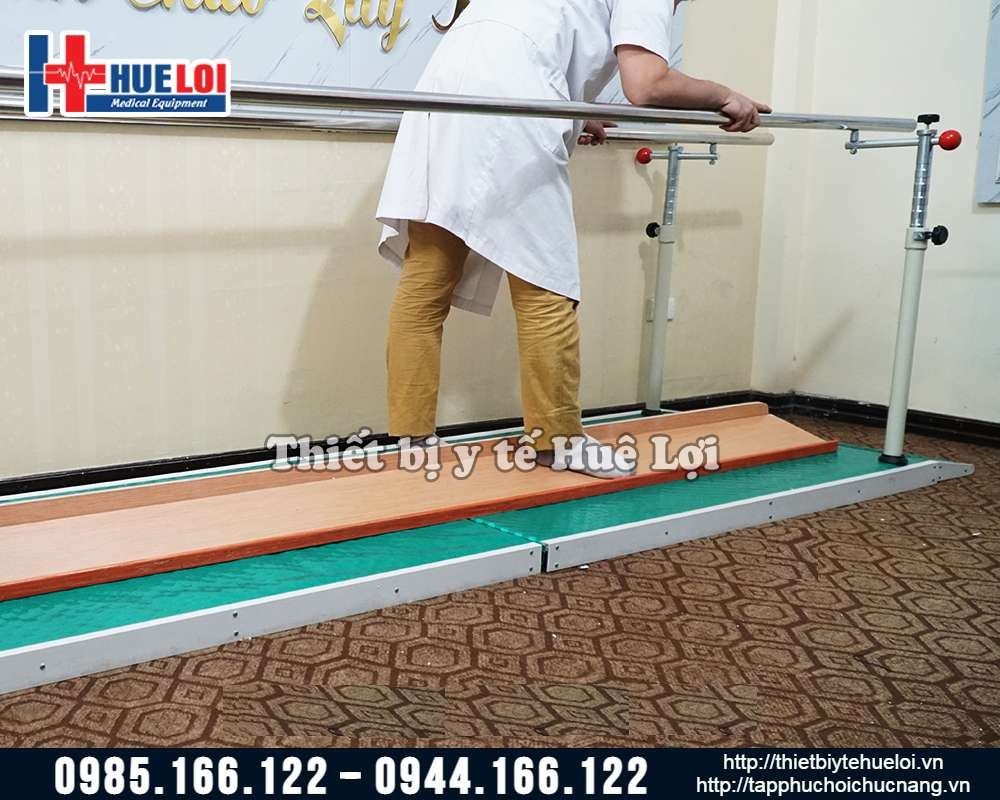 - Khoảng cách giữa 2 thanh song song đủ rộng và cũng có thể điều chỉnh để đặt vừa xe lăn. Điều này trợ giúp cho việc bệnh nhân tập đứng hoặc quá trình tập đi nếu mệt có thể ngồi nghỉ